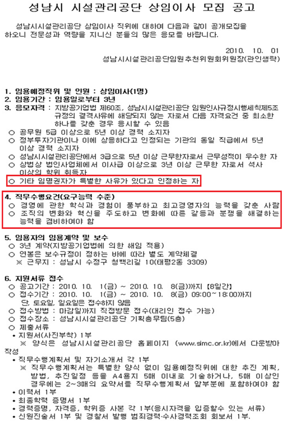 행정안전위원회 소속인 최 의원이 입수한 2010년 10월 당시 「성남시시설관리공단 상임이사 모집 공고문」에 따르면, 임원추천위원회는 직무수행요건(요구능력 수준)으로 ‘경영에 관한 학식과 경험이 풍부하고 최고경영자 능력을 갖춘 동시에 조직 변화와 혁신을 주도하는 능력까지 겸비해야 한다’고 적시했다.