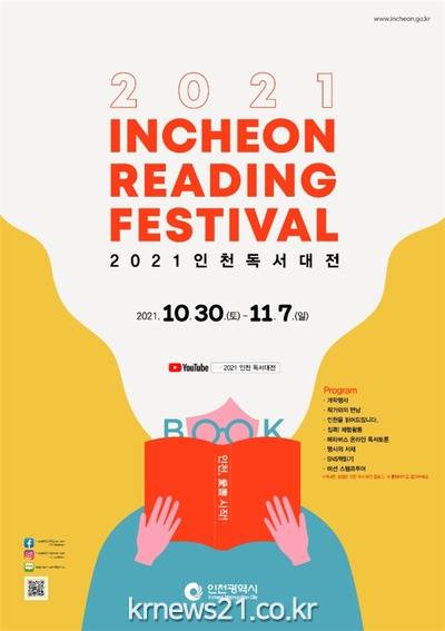슬로건‘인천, 애서(愛書) 시작!’처럼 ‘2021 인천 독서대전’은 10월 30일 독서진흥유공자 시상식과 함께하는 개막행사로 문을 열어 11월 7일까지 9일간 온‧오프라인을 통해 강연, 공연, 체험행사 등을 선보이며 매년 다채로운 독서행사로 인천시민과 함께할 예정이다.