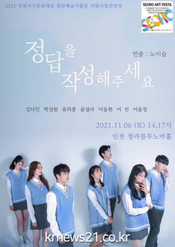 한편 이번 #정답을작성해주세요는 다양한 분야에서 활동하고 있는 젊은 청년 예술인들이 대거 참여한다. 박성원 대표가 배우로 함께하며, 김다인, 이선, 이동현, 유의봉, 윤설아, 이윤정 배우와 무대 기술팀 양병환 무대 감독, 신강림 조명 감독 등이 참여한다. 작품은 11월 6일 인천청라블루노바홀에서 볼 수 있다.