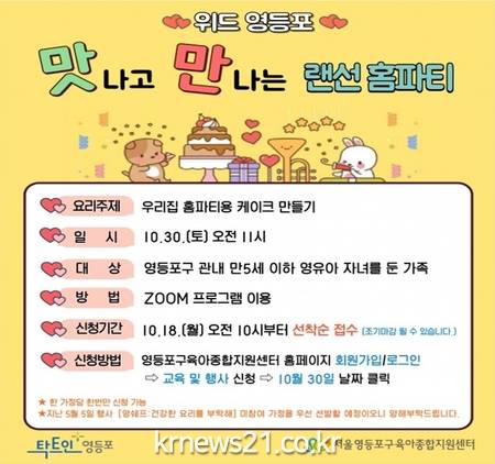 ‘위드 영등포, 맛나고 만나는 랜선 홈파티’는 사전 참여를 신청한 영유아 가정 중 100가구를 선정, 전문 셰프와 함께 온라인 실시간 소통을 하며 홈파티 메인 요리인 케이크를 만드는 요리체험 행사다.