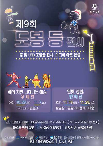 ‘2021년 제9회 등 전시’는 지역 주민들이 걷기 위해 자주 찾는 장소인 우이천과 방학천 두 곳에서 펼쳐진다. 먼저 우이천 등 전시는 ‘해가 지면 나타나는 예술, 우이천’이라는 주제를 가지고 우이교~쌍한교 구간에서 10월 29일부터 11월 7일까지 진행되며, 방학천 등 전시는 ‘달빛 정원, 방학천’이란 주제로 정병원~금강아미움파크타운 구간에서 11월 19일부터 11월 28일까지 이어진다.
