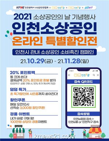 ▲ [사진=홍보포스터]인천광역시(시장 박남춘)는 법정기념일인 11월 5일 ‘소상공인의 날’을 기념해 10.29.(금) ~ 11.28.(일) 한달 간 ‘인천 소상공인 온라인 특별 할인전’을 개최한다고 밝혔다.