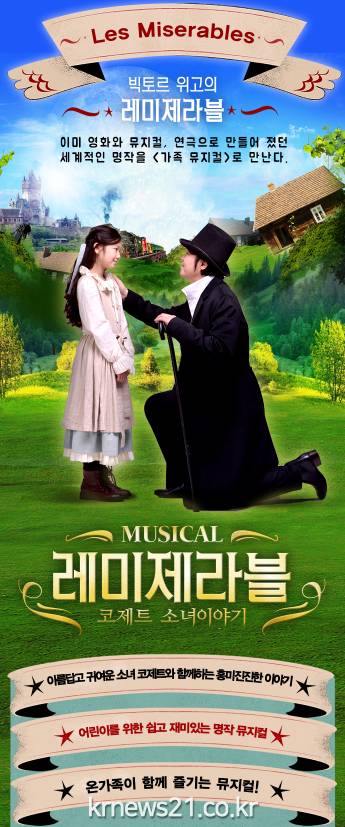 어린이뮤지컬 ‘레미제라블 코제트 소녀 이야기’는 영화와 뮤지컬을 통해 많이 선보인 세계적인 명작 빅토르 위고의 ‘레미제라블’을 가족뮤지컬로 재해석한 공연으로 어린이들이 이해하기 쉽게 제작됐으며 오는 11월 10일까지 볼 수 있다.