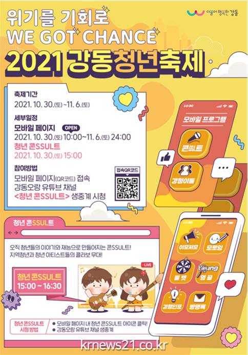 ▲ [사진=홍보포스터]강동구(구청장 이정훈)가 오는 10월 30일(토)부터 11월 6일(토)까지 2021년 강동청년축제를 온라인으로 개최한다.