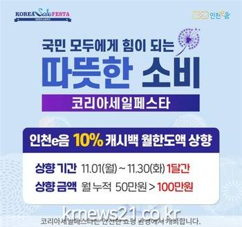 한편, 인천e음 플랫폼의 온라인 시민 복지몰인 인천e몰에서도 코리아세일페스타 기념해 구매제품 인증 시 추첨을 통해 포인트를 증정하는 내돈내산 인증이벤트, 인천e몰 장바구니 쿠폰 등 다채로운 행사가 진행된다.