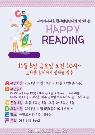 「Happy Reading」은 11월 19일 ~ 12월 17일까지 매주 금요일 총 5주동안 마장도서관 지혜숲 강의실에서 대면으로 운영된다. 초등 1학년을 대상으로 한 Class A는 매주 금요일 오후 4시 ~ 4시40분, 초등 2~3학년을 대상으로 한 Class B는 오후 4시50분 ~ 5시30분까지 2차례 운영된다.