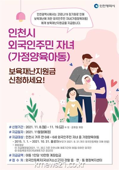 지원대상은 만0세∼만6세의 미취학 아동으로 어린이집 또는 유치원을 다니지 않고 가정에서 양육하는 2015년 1월 1일부터 2021년 10월 31일 사이에 태어난 아동이다. 외국인주민이 인천시 관내에 91일 이상 거주하고 2021년 8월 31일 이전에 외국인등록을 마친 외국인주민이어야 한다.