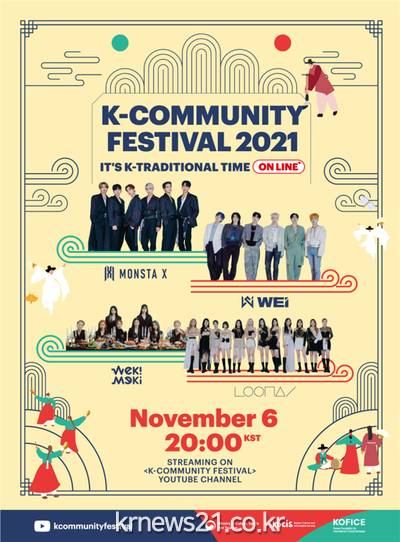 ▲ [사진=홍보포스터]문화체육관광부(장관 황희) 해외문화홍보원[원장 박정렬, 이하 해문홍(KOCIS)]은 한국국제문화교류진흥원(원장 정길화, 이하 진흥원)과 함께 11월 6일(토) 오후 8시, ‘2021 한류 동호회와 한국문화 함께 잇기(케이-커뮤니티 페스티벌)’를 온라인(www.youtube.com/kcommunityfestival)으로 개최한다.