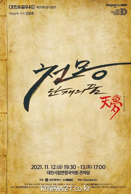 ▲ [사진=홍보포스터]대전시립무용단은 제70회 정기공연 ‘천몽(天夢) - 단재의 꿈’이 11월 12일부터 13일까지 대전시립연정국악원 큰마당 무대에서 작품을 선보인다.