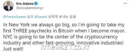 ▲ [에릭 애덤스 미국 신임 뉴욕시장 당선인 트위터 캡처]에릭 애덤스 미국 뉴욕시장 당선인이 취임 후 첫 3개월 치 급여를 비트코인으로 받겠다며 밝혔다. 취임도 하기 전에 가상화폐 산업 지원을 선언한 것이다.
