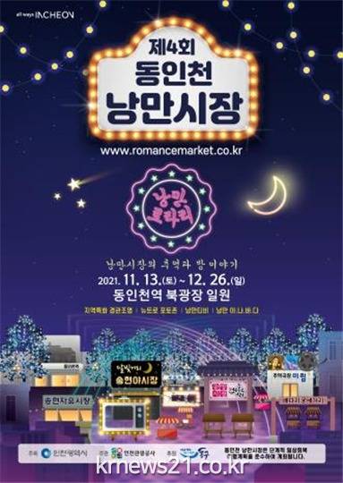 인천광역시(시장 박남춘)와 인천관광공사(사장 민민홍)는 오는 11월 13일(토)부터 12월 26일(일)까지 동인천역 북광장에서‘제4회 동인천 낭만시장’을 개최한다고 밝혔다.