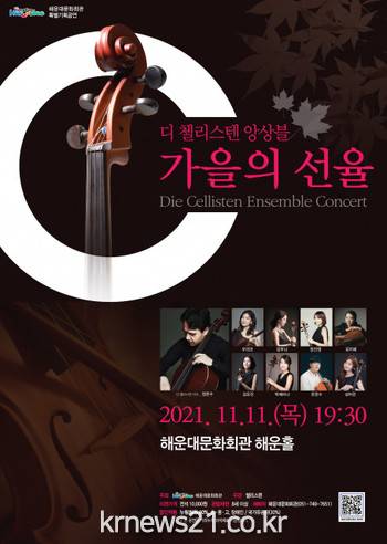 ▲ [사진=홍보포스터]해운대문화회관(관장 김영순)은 특별 기획으로 디 첼리스텐 앙상블의 첼로 앙상블 ‘가을의 선율’ 공연을 11월 11일(목) 저녁 7시 30분 해운홀에서 진행한다.