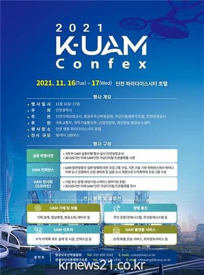 ▲ [사진=홍보포스터]인천광역시(시장 박남춘)는 11월 16일부터 17일까지 영종도 파라다이스시티 호텔에서 “2021 K-UAM Confex”를 개최한다고 밝혔다.