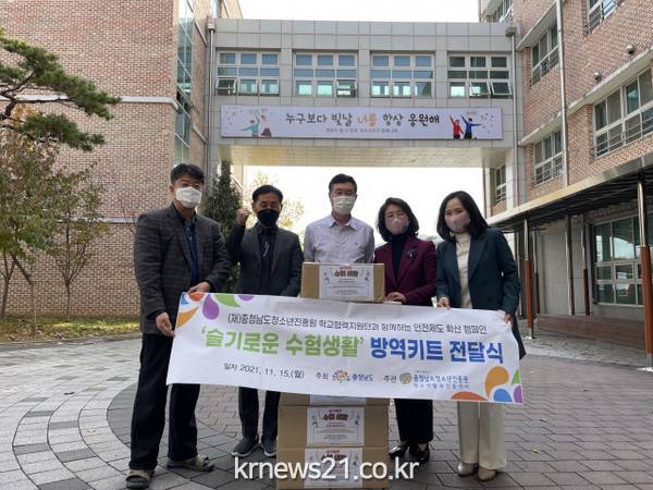 ▲ [사진제공 = 재단법인 충청남도청소년진흥원]재단법인 충청남도청소년진흥원(원장 박영의) 활동진흥센터에서는 도내 15개 시·군의 균형적인 청소년 활동을 지원하기 위해 ‘학교협력지원단’을 운영하고 있으며, 학교협력지원단과 연계해 16개의 고등학교 고3 청소년에게 수능 합격과 안전한 청소년 활동 안내 메시지를 담은 코로나19 대비 수능 방역키트 2329개를 전달했다.