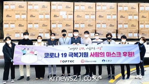 ‘(사)희망을나누는사람들’은 ‘㈜톱텍’에서 후원받은 8천4백만 원 상당의 마스크 25만6천 장을 전달했으며, 도봉구는 전달받은 물품을 사회복지시설 등 취약계층에 전달할 예정이다.