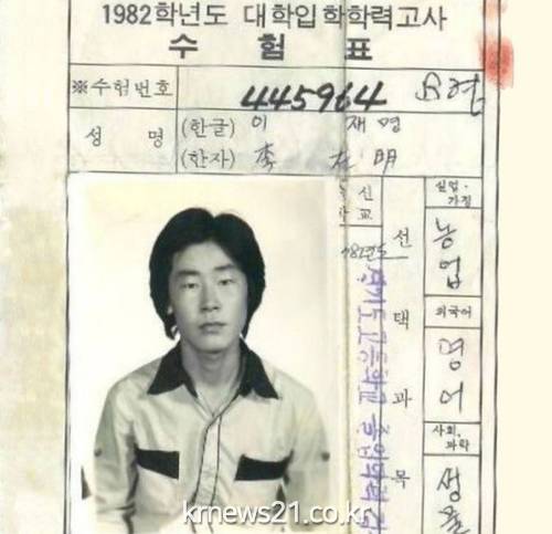 이날 이 후보가 올린 '1982학년도 대학입학학력고사 수험표'에는 청년 이 후보의 사진과 수험번호, 이름, 선택과목 등이 적혀 있다. 누렇게 색이 바랜 수험표에는 수험번호 '445964'가 또렷이 명기돼 있고, 오른쪽에는 '농업' 영어' '생물' 등 선택과목이 기재돼 있다.