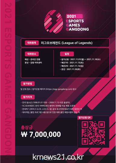 ▲ [사진=홍보포스터]강동구(구청장 이정훈)는 청소년 E-스포츠 대회인 ‘2021년 E-게임즈 강동’을 오는 11월 20일(토) 오전 11시부터 오후 4시까지 강동아트센터에서 개최한다고 밝혔다.