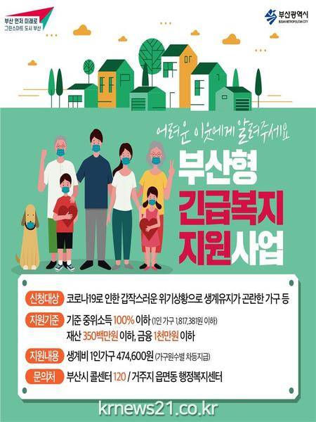조영태 부산시 사회복지국장은 “코로나19로 어려움을 겪었으나 법정 지원을 받지 못하는 저소득 위기가구가 소외되지 않도록 신속하게 생계비를 지원하고, 겨울철이 다가오는 만큼 복지 사각지대 해소를 위해 적극 나설 예정”이라며 “시민 여러분들께서도 위기 상황에 놓인 이웃을 발견하실 경우, 즉각 가까운 행정복지센터로 알려주시기를 바란다”라고 전했다.