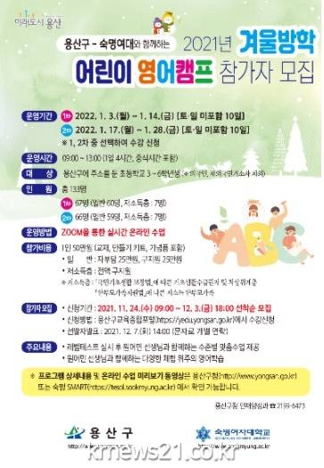 ▲ 사진=용산구청서울 용산구(구청장 성장현)가 숙명여자대학교(총장 장윤금)와 함께 겨울방학 어린이 영어캠프를 운영한다.