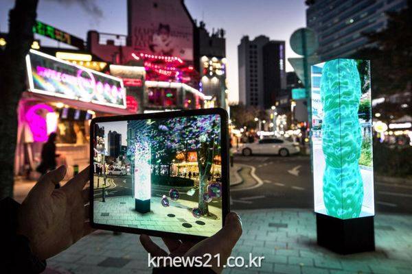 또한, 홍대 거리의 다양한 데이터를 재료로 삼아 시각예술화한 LED 조형물(어울마당로 138)도 공개했다. 신준식 작가의