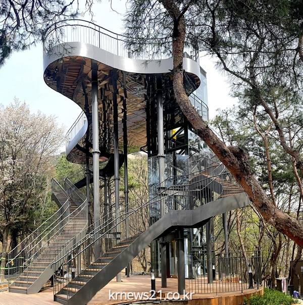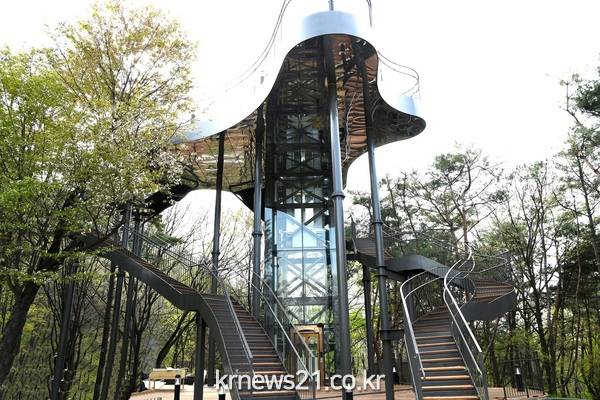 지난 4월 개장한 전망대는 기존의 노후 전망대를 새로 지으며 승강기를 추가로 설치한 것으로 노약자, 장애인 등 보행약자도 전망대에 올라 주변 경관을 함께 누릴 수 있도록 한 점이 호평을 받았다. 전망대 주변 2.1㎞ 길이의 순환산책로는 전동휠체어와 유모차 이용이 가능한 무장애 숲길로 조성돼 보행약자의 이용이 잦은 곳이지만 전망대에는 오르지 못해 아쉬움이 컸기 때문이다.