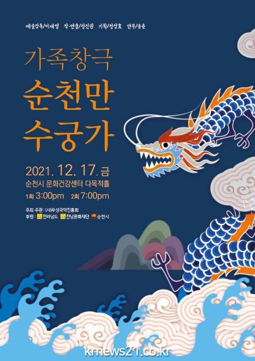 온 가족이 함께 즐길 수 있는 가족창극 ‘순천만 수궁가’가 오는 12월 17일 오후 3시와 7시 순천 문화건강센터 다목적홀에서 공연한다.