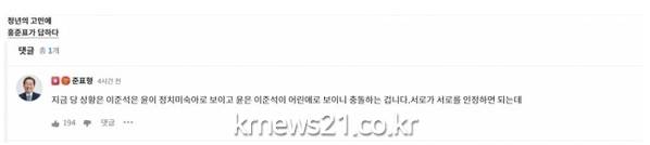홍 의원은 윤 후보의 추천으로 이수정 경기대 범죄심리학과 교수가 공동 선거대책위원장으로 인선된 데 대해선 "범죄 심리학을 전공한 사람이 대선에 무슨 도움이 될지. 아무리 정치판이 범죄 혐의자들 판이지만 글쎄"라며 부정적 뜻을 보였다. '어쩔 수 없이 이재명 후보에게 한 표 행사하겠다. 아무리 생각해도 윤 후보는 못 찍겠다'라는 글에는 "그래도 이재명은 안 돼요"라고 짧게 썼다.
