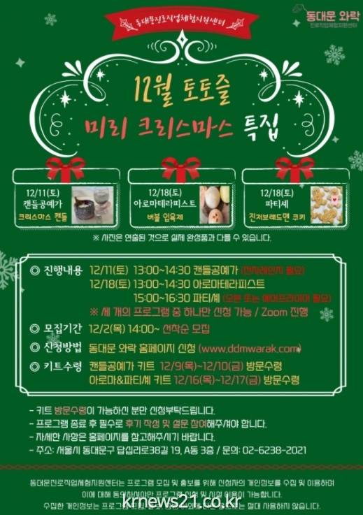▲ 사진=동대문진로직업체험지원센터 포스터 / 동대문구동대문구는 2021년 연말을 맞아 지역 청소년을 대상으로 동대문진로직업체험지원센터(이하 동대문 와락)에서 미리 크리스마스 특집 토요직업체험 프로그램을 진행한다고 밝혔다.