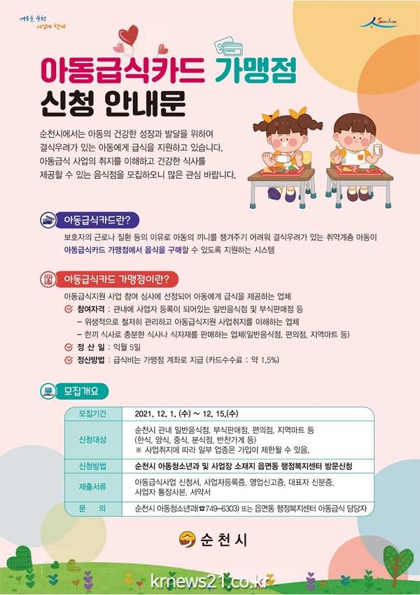순천시(시장 허석)는 결식우려가 예상되는 아동에게 다양한 급식을 제공하기 위해 내년부터 시행하는 아동급식카드 가맹점 모집을 오는 15일까지 모집한다.