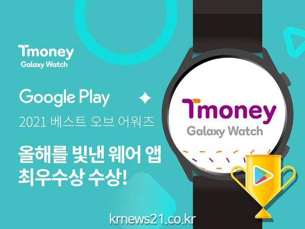 ▲ 사진제공=(주)티머니교통카드를 뛰어넘어 ‘Mobility'와 ’Payment' 영역 대표기업으로 성장하고 있는 (주)티머니(대표이사 김태극)는 웨어러블 스마트 기기 전용 간편결제 서비스, ‘티머니 갤럭시워치 앱’이 ‘구글플레이 베스트 오브 어워즈(Best Of Awards) 2021’에서 ‘올해를 빛낸 웨어 앱 최우수상’을 수상했다고 3일 밝혔다.