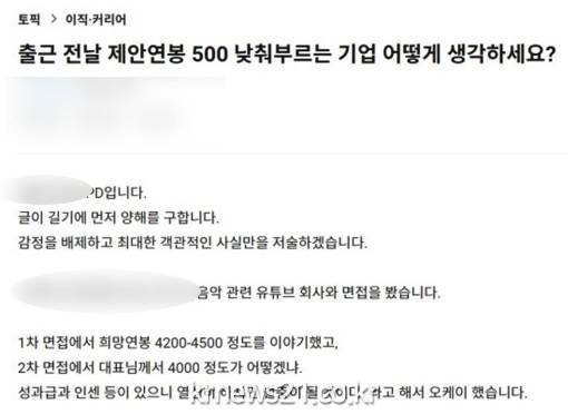 직장인 익명 커뮤니티 블라인드에는 지난 5일 ‘출근 전날 제안연봉 500만원 낮춰 부르는 기업 어떻게 생각하세요?’라는 글이 올라왔다. 자신을 경력 6년차 영상 PD라고 밝힌 A씨는 “1차 면접에서 희망 연봉 4200만~4500만 정도를 얘기했다”며 “지난달 29일 2차 면접에서 대표님이 4000만원 정도가 어떻겠느냐고 말해 받아들였다”고 적었다.