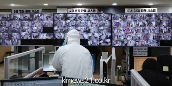 ▲ 사진=연합뉴스코로나19 거점전담병원인 평택 박애병원 상황실에서 방호복을 입은 의료진이 수술실로 들어가기 전 전화통화를 하고 있다.