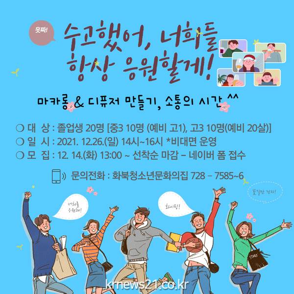 ▲ 사진=제주시제주시는 오는 26일 중등 3학년, 고등 3학년 청소년 대상 화북청소년문화의집 ‘수고했어, 너희들 – 항상 응원할게!’프로그램을 운영할 계획이라고 밝혔다.