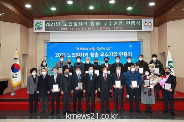 충청북도는 14일(10시 30분) 도청 대회의실에서 ‘2021년 노인일자리 창출 우수기업 인증식’을 개최하고 올해 노인일자리 창출에 기여한 우수기업 인증(20곳)과 우수기관(3곳), 유공자(9명)에 대해 표창장을 수여했다.