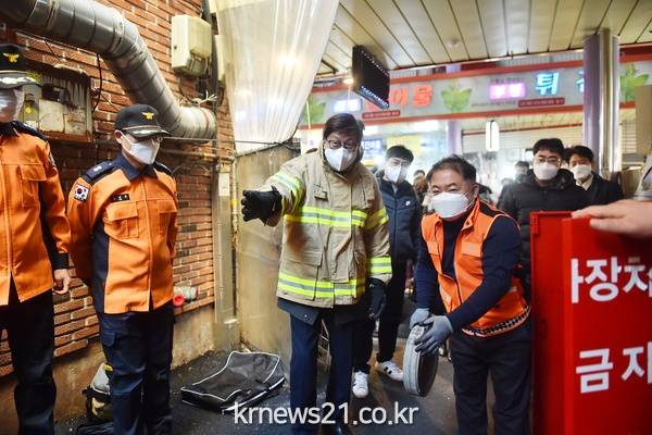 박형준 시장은 먼저, 중부소방서와 함께 부평깡통시장을 찾아 시장 내 소화용수설비와 소화·경보설비 등 소방시설 설치현황을 살펴보고, 비상소화장치 작동 여부를 확인하는 등 전통시장 소방 안전대책을 꼼꼼히 점검했다.