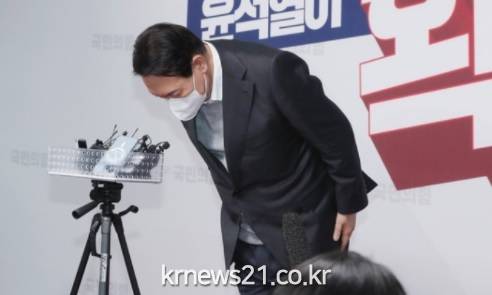 윤 후보는 이날 사과문을 읽으며 90도로 고개를 숙이기도 했다.