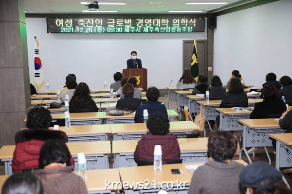 ▲ [사진=제주시청]안동우 제주시장은 12월 20일(월) 제주축산농협 아라종합타운에서 개최된 『여성축산인 글로벌 경영대학』에 참석해 신입생 및 관계자들을 격려했다.