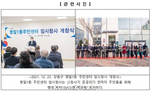 ▲ 사진=강동구강동구(구청장 이정훈) 명일1동 주민센터가 강동첨단복합청사 복합개발사업 추진으로 인해 철거가 예정됨에 따라, 신축청사 건립기간 동안 동 행정업무를 수행할 수 있는 임시청사(강동구 양재대로 1634, 2층)로 이전하고 지난 23일 개청식을 열었다.