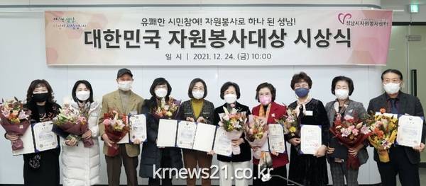 ▲ 사진=성남시성남시는 시민 10명이 행정안전부가 주관하는 ‘2021년 대한민국 자원봉사 대상’ 수상자로 선정돼 국무총리·장관 표창장을 받았다고 12월 24일 밝혔다.