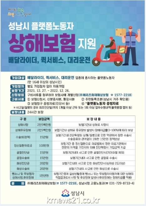 성남시 고용노동과 관계자는 “스마트폰 앱 등 플랫폼을 통해 노무를 제공하고 수수료를 받는 플랫폼노동자들의 특성상 산재보험 가입이 어려워 상해보험 가입을 지원하게 됐다”면서 “성남시는 7월부터 지원 중인 산재보험료와 유급병가에 이어 이번 상해보험 지원까지 3종 사업을 추진해 노동 취약계층의 사회안전망을 구축하고 있다”고 말했다.