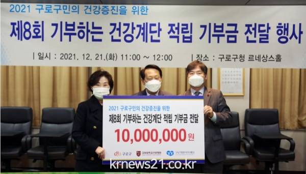 21일 구청 르네상스홀에서는 건강계단 기부금 전달식이 개최됐다. 이날 행사에는 이성 구청장, 정희진 고려대학교 구로병원장, 오승주 구로구희망복지재단 사무국장 등이 참석했다.