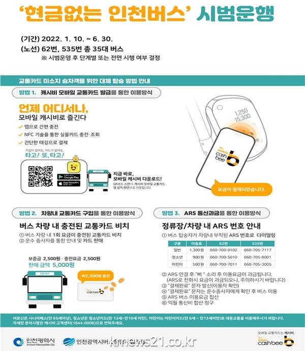 인천광역시는 1월 10일부터 6월 30일까지 일부 시내버스 노선(62번, 535번 버스 35대)의 현금요금함을 철거하고 버스 현금승차 폐지 시범노선을 운영한다고 밝혔다.
