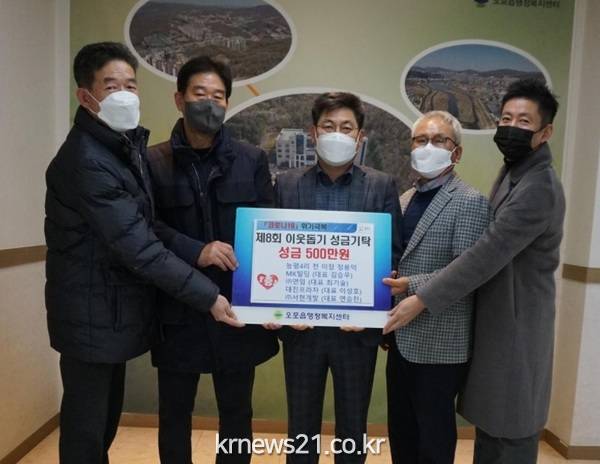 ▲ 사진=광주시광주시 오포읍 능평4리 전 이장 정용덕씨는 28일 MK빌딩 김승우 대표, ㈜연임 최기술 대표, 대진프라자 이성호 대표, ㈜서현개발 연규진 대표와 오포읍 행정복지센터를 방문해 이웃돕기 성금 500만원을 기탁했다.