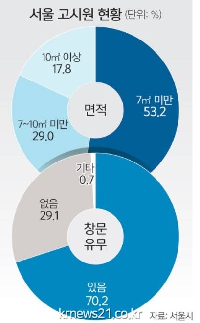 한국도시연구소의 2020년 실태조사에 따르면 서울시내 고시원 평균 주거면적은 7.2㎡에 불과하고, 절반 이상(53%)이 7㎡ 미만으로 나타났다. 또 화재나 비상상황 시 대피가 가능한 창문이 설치된 곳은 47.6%에 불과했다.