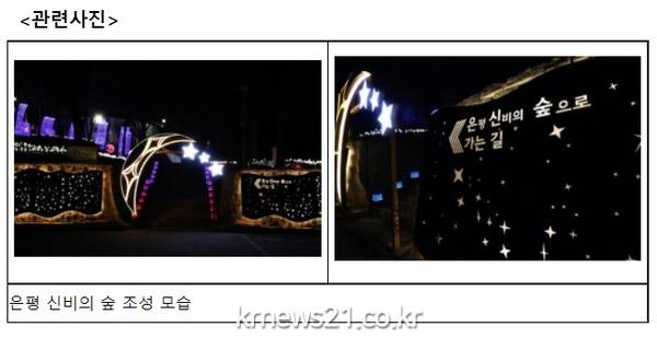 ‘은평 신비의 숲’은 코로나로 지친 주민에게 위로와 희망의 메시지를 전하고자 조성됐다. 빛터널, 보름달과 토끼, 은하수 조명, 유니콘 등 신비로움과 희망을 상징하는 LED 경관조명 시설물이 설치됐다. 색다른 문화공간을 연출하며 희망 문구도 함께 게시한다. 앞으로 다양한 문화행사와 주민 휴식 공간으로 은평구 명소가 될 것으로 보인다.