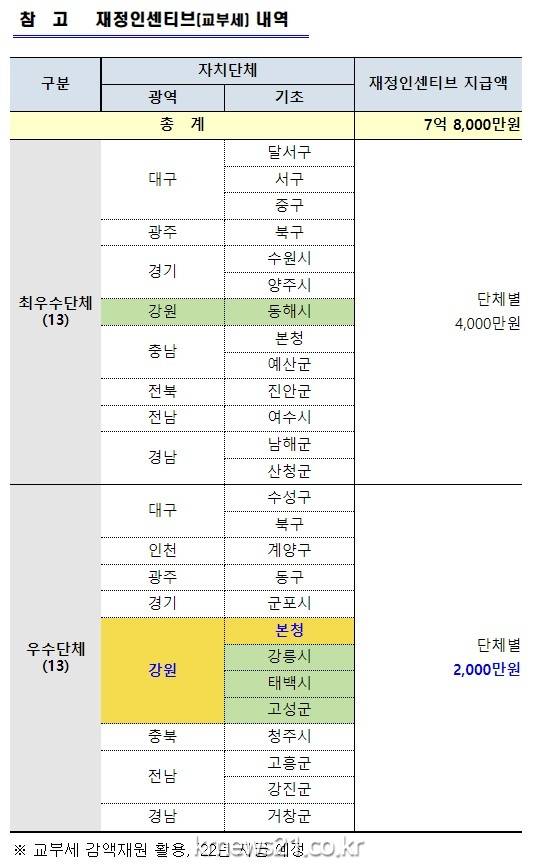17개의 광역자치단체는 1개의 그룹으로 유형화되어 평가되었는데, 그 결과 강원도가 우수 광역자치단체(2위)로 선정되어, 기관 표창과 함께 2,000만 원의 재정인센티브(교부세)를 받게 되었다.
