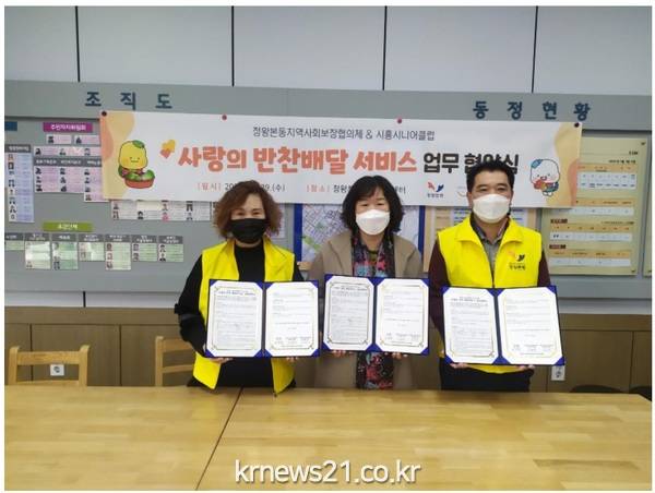 ▲ 사진=시흥시정왕본동 지역사회보장협의체(민간위원장 김혜숙, 공공위원장 오을근)는 지난 29일 시흥시니어클럽(관장 이순남)과 ‘사랑의 반찬 배달서비스’ 추진을 위한 업무 협약을 체결했다. 이로써 취약계층의 영양 섭취에 적극적인 도움을 주게 됐다.
