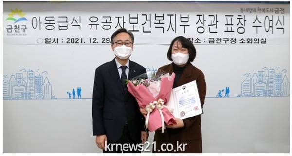 ▲ 사진=금천구금천구(구청장 유성훈)는 12월 29일(수) 사회적 기업인 ㈜이그린(대표 신정희)이 ‘2021년 아동급식 지원사업’ 보건복지부 장관 표창을 받았다고 밝혔다.