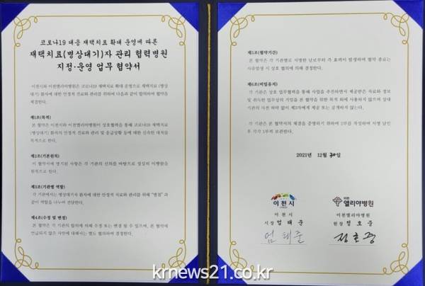 이번 협약을 통해 시는 이천엘리야병원에 필요한 행정 지원 및 협조를 적극 이행하고, 이천엘리야병원은 코로나19 재택치료(병상대기)자의 재택격리 기간 동안 안정적 치료 및 생활 관리 등 의료서비스 제공을 적극적으로 수행할 예정이다.