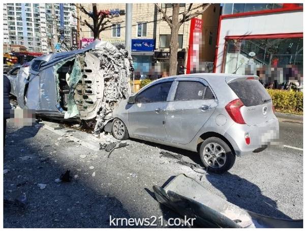 ▲ 사진=부산경찰서부산 한 대형마트 5층 주차장에서 도로로 추락해 7명의 사상자를 낸 택시는 당시 시속 70㎞의 속도에서 사고를 낸 것으로 나타났다.